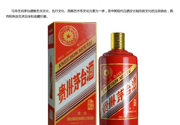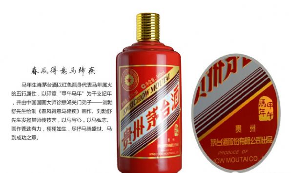 馬年生肖茅臺酒以紅色瓶身代表馬年屬火的五行屬性,以印章“甲午馬年”為干支紀年,并由中國國畫大師徐悲鴻關門弟子--劉勃舒先生繪制《春風得意馬蹄疾》畫作。劉勃舒先生發(fā)揚其師傳技藝,以馬寫心,以馬弘志。畫作蒼勁有力,栩栩如生,盡抒馬騰盛世、馬到成功之意。