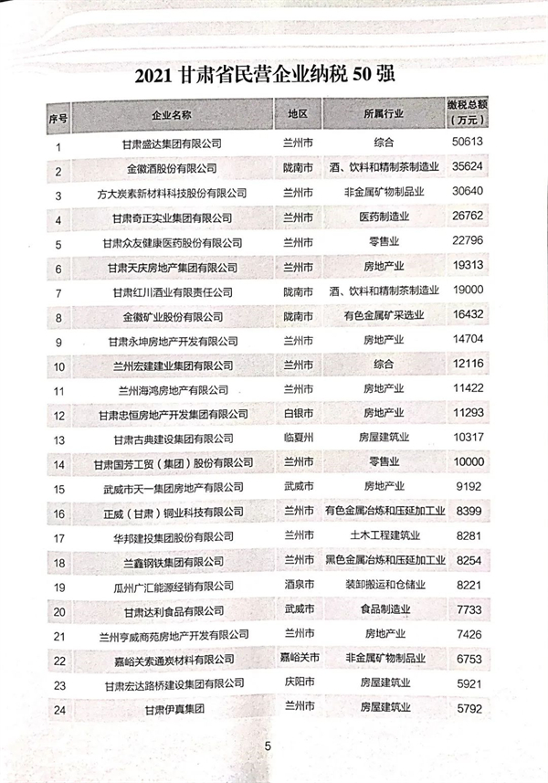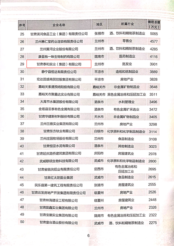 2021甘肅省上規(guī)模民營企業(yè)調(diào)研,共有321 家年?duì)I業(yè)收入1000 萬元以上的民營企業(yè)參加,經(jīng)各級(jí)工商聯(lián)及相關(guān)單位收集、整理、數(shù)據(jù)分析、審核通過,形成 2021 甘肅省民營企業(yè)營業(yè)收入、納稅、安置就業(yè)50強(qiáng)。2月21日,甘肅省工商業(yè)聯(lián)合會(huì)(總商會(huì))十二屆六次執(zhí)委會(huì)議上發(fā)布了2021甘肅省民營企業(yè)“3個(gè)50強(qiáng)”名單,甘肅泰和實(shí)業(yè)(集團(tuán))有限公司榮登榜單,位列營業(yè)收入50強(qiáng)第12位、納稅50強(qiáng)第29位。